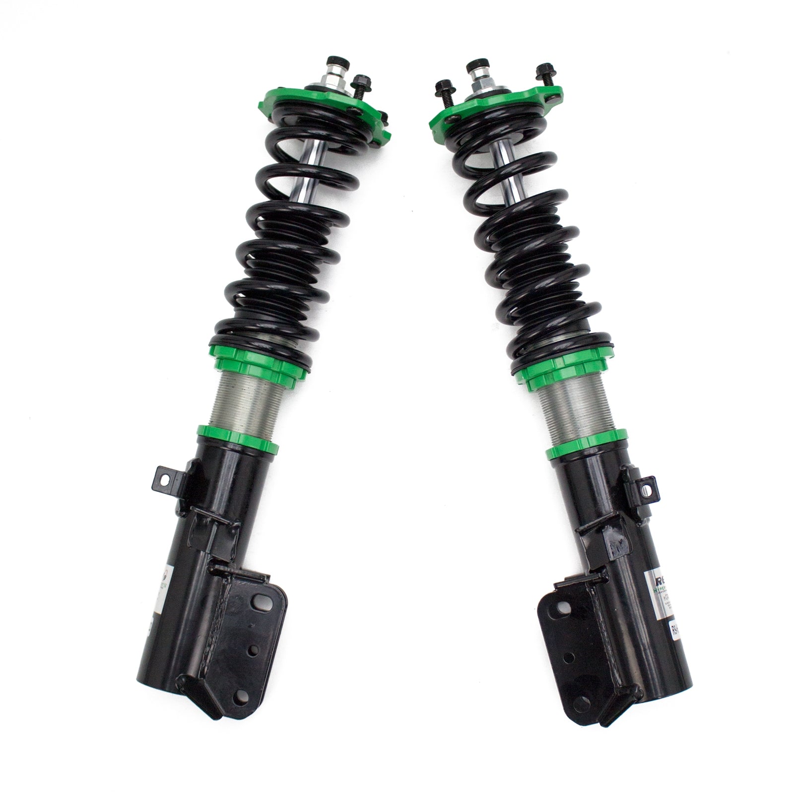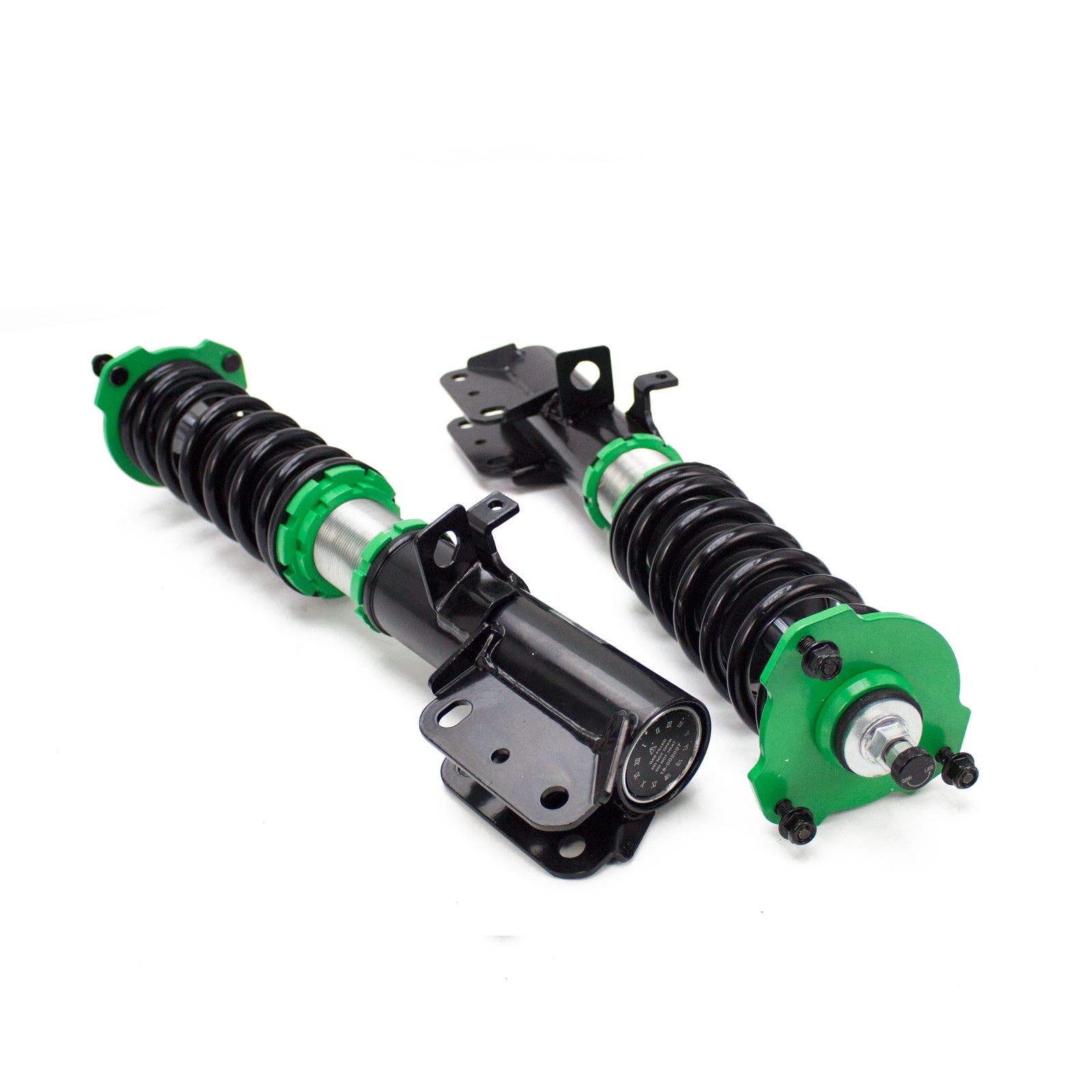 Hyper-Street II coilover suspension upgrade features mono-tube shocks with 32 clicks rebound settings and full length adjustable. Mono-tube shocks provides larger capacity for gas and oil to improve comfortable level of typical lowering vehicle. Special 32 clicks of valving allows user to fine tune rebound force settings. Independent spring tension and full length adjustable allows drop without sacrifice comfort by shorten pitch distance.