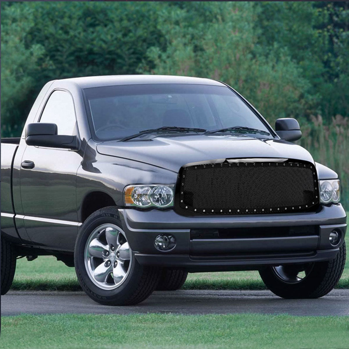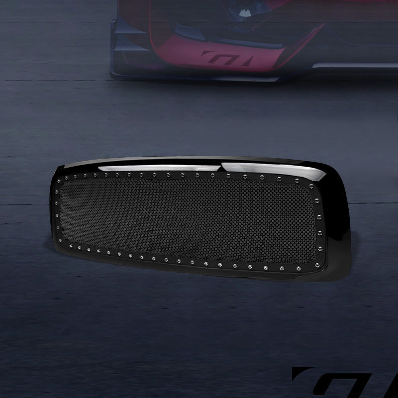 HS Power Front Grill Cover Glossy Black RVT Rivet Bolt Mesh Style Front Bumper Grille Guard 2002-2005 Dodge Ram